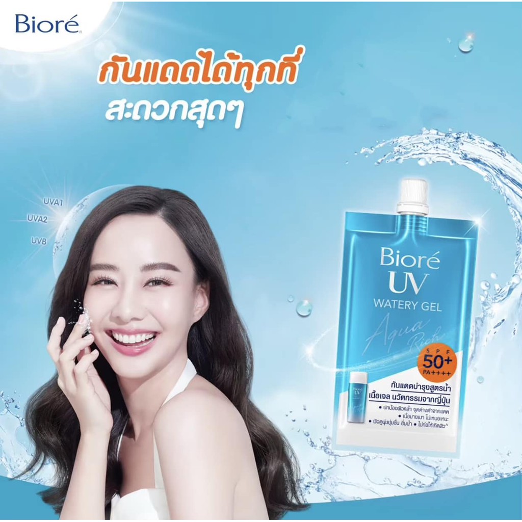 Biore Aqua Rich Watery Gel นั้นคือสกินแคร์สำหรับกันแดดเนื้อเจลพร้อมบำรุง ปกป้องผิวจากฝ้า กระ จุดด่างดำที่เกิดจากแสงแดด ให้ความชุ่มชื้นเพื่อผิวอิ่มน้ำ นุ่ม มาในรูปแบบเอสเซนส์เนื้อบางเบา เกลี่ยง่าย ไร้กังวลเรื่องคราบ ซึมซาบเข้าสู่ผิวได้อย่างรวดเร็ว ไม่เหนียวเหนอะหนะ ทาทับเมคอัพในระหว่างวันได้ อีกทั้งยังไม่ทำให้เมคอัพเปลี่ยนสี ที่สำคัญกันน้ำ กันเหงื่อ ติดทนยาวนาน
