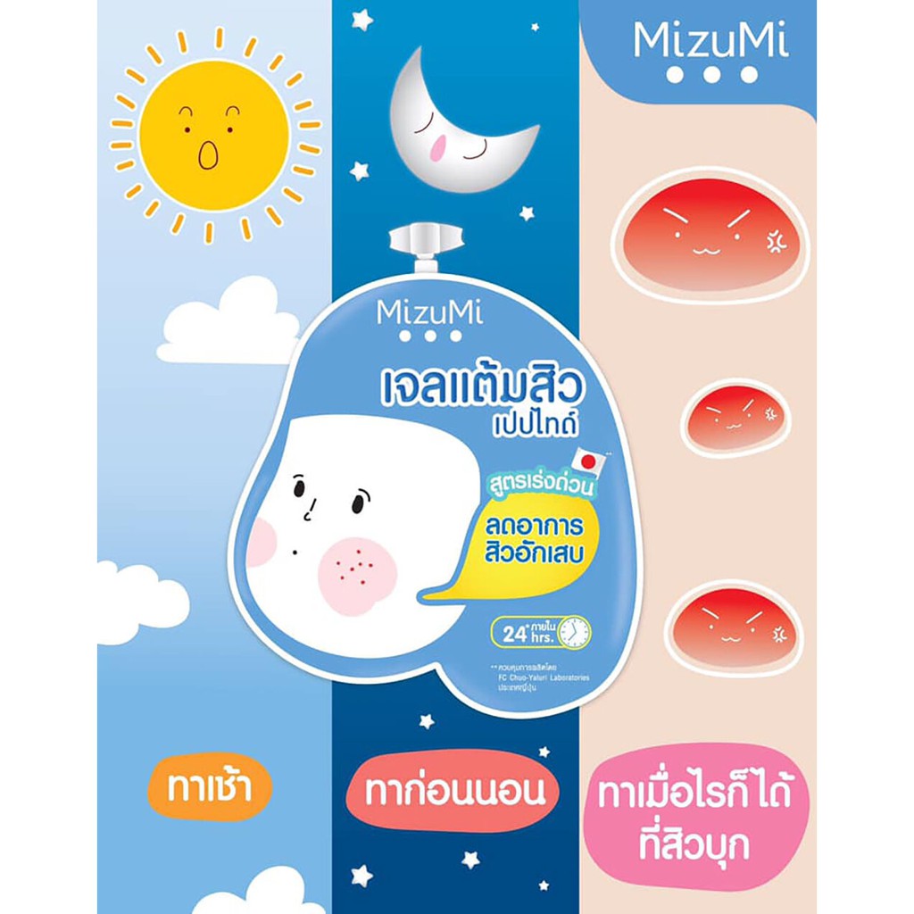 Mizumi peptide acne gel นั้นมีขนาด 4 กรัม ทางแบรนด์เคลมว่าเขาช่วยลดการอักเสบของสิวได้เป็นอย่างดี เร่งด่วนภายใน 24 ชั่วโมง พร้อมลดโอกาสการเกิดรอยแผลเป็นจากสิวใหม่อย่างต่อเนื่อง เนื้อเจลบางเบา สบายผิว ไม่เป็นคราบจึงสามารถแต่งหน้าทับได้